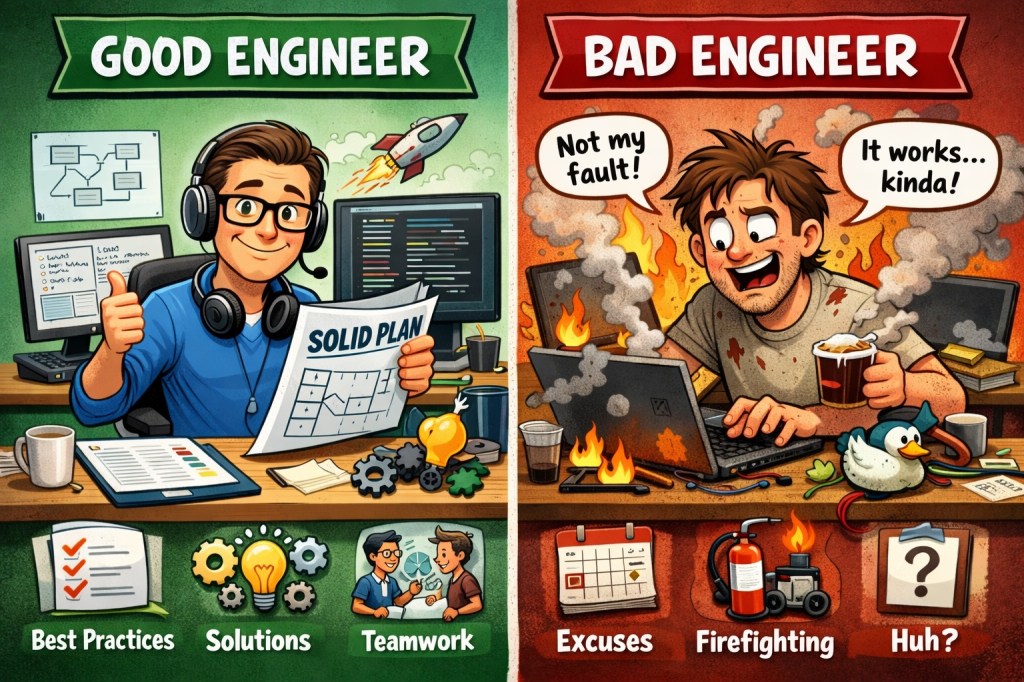 Good engineers lead by example. They know that they must understand something before they can show others. Bad engineers lead by assumption. They think they know what someone else should be doing without the full picture. Good engineers are disciplined. They understand the value of process and consistency. Bad engineers are unpredictable. They consider all processes to be overhead. Good engineers think outside the box. They understand that sometimes a creatively simple solution is better than a standard complex solution. Bad engineers do things the way they’ve always done it. They don’t consider the scale and complain that they have too much to do. Good engineers define their job and their success. Bad engineers constantly want to be told what to do.